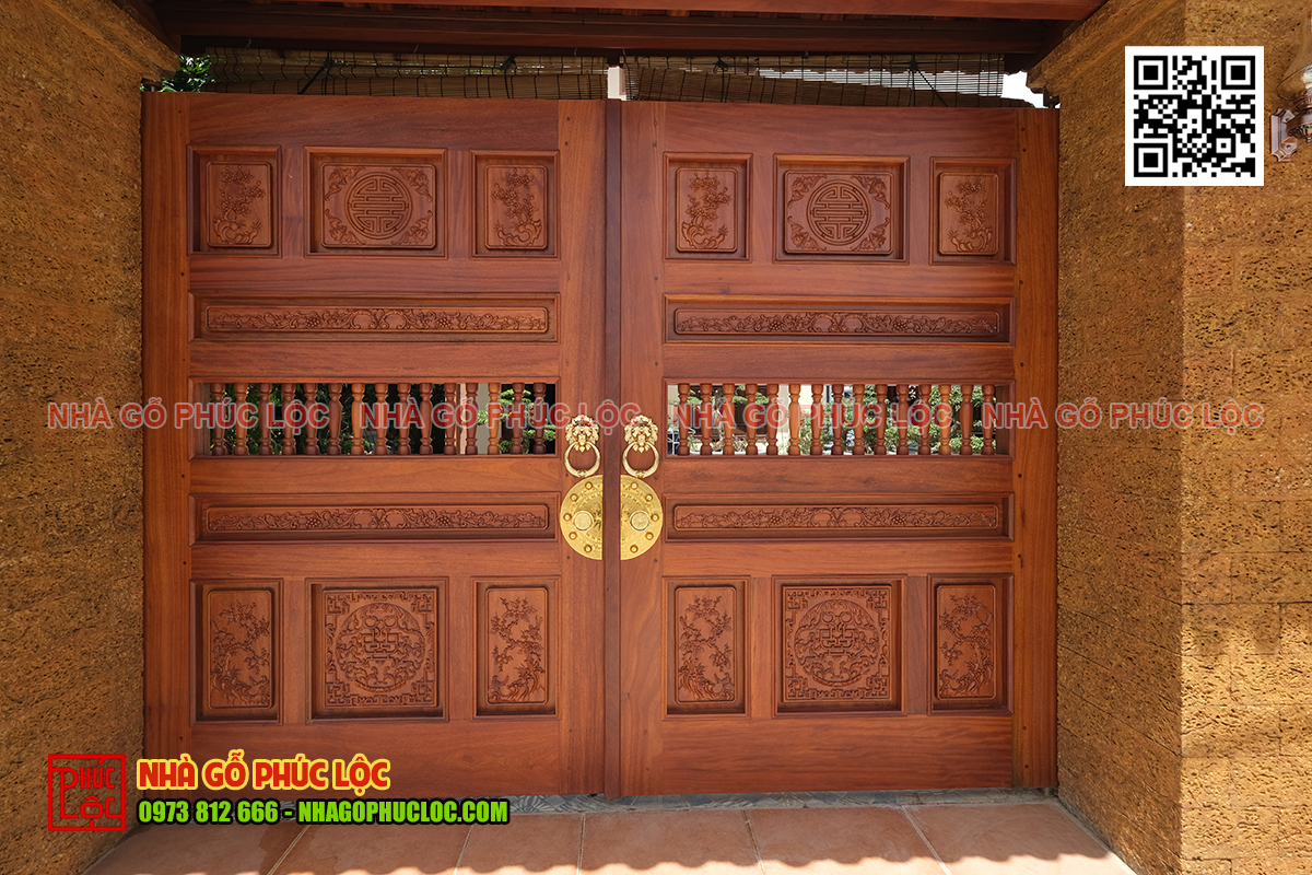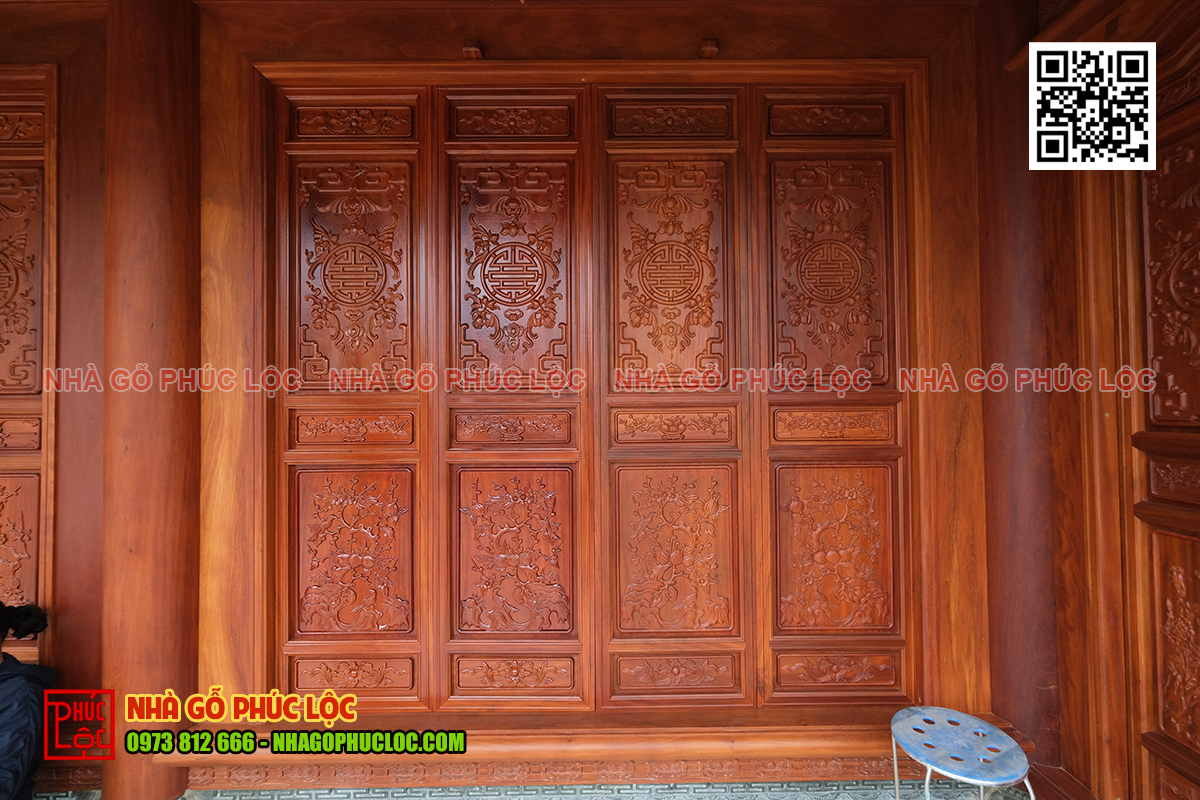 Một trong những mẫu hoa văn đẹp và ấn tượng trên nhà gỗ cổ truyền là ngũ phúc lâm môn. Thường được chạm trên cửa bức bàn của ngôi nhà gỗ truyền thống. Đây là hình tượng của 5 con dơi vây quanh chữ ‘phúc’. Ý nghĩa của hoa văn này là mong muốn gia chủ luôn được bình an, may mắn và hạnh phúc.