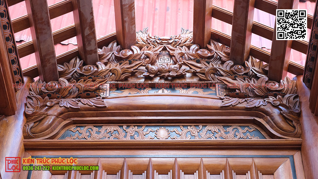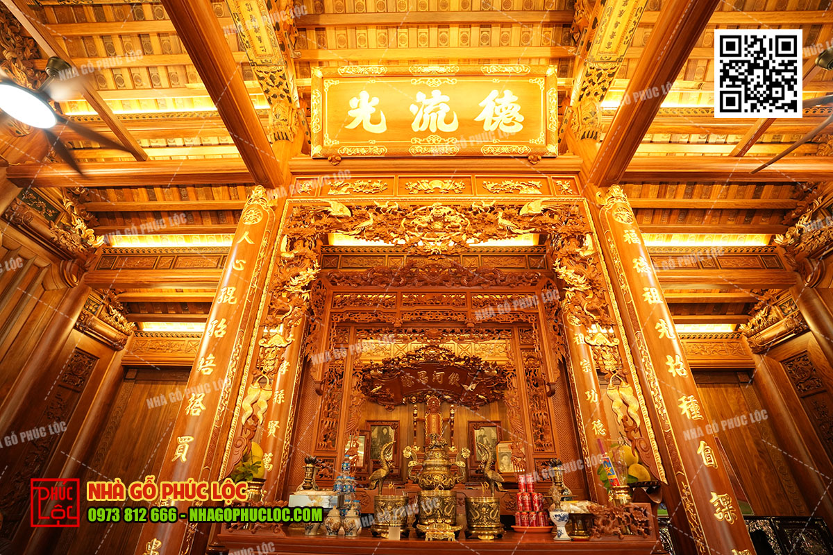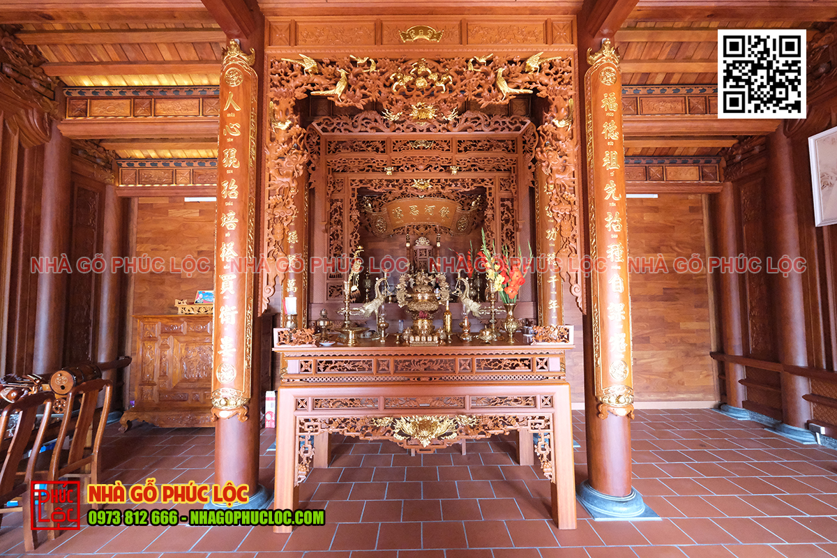 Khu vực thờ cúng thường được chọn làm trung tâm của ngôi nhà gỗ. Hoa văn rồng phượng xuất hiện trên hoành phi, câu đối và bức cửa võng, tạo nên không khí trang trọng, tôn kính tổ tiên. Hình ảnh rồng phượng uốn lượn quanh chữ Hán hoặc họa tiết mây lửa mang ý nghĩa cầu mong bình an, sung túc và hòa thuận trong gia đình. Đây cũng là nơi thể hiện rõ nhất tài hoa và tinh thần của người thợ chạm.