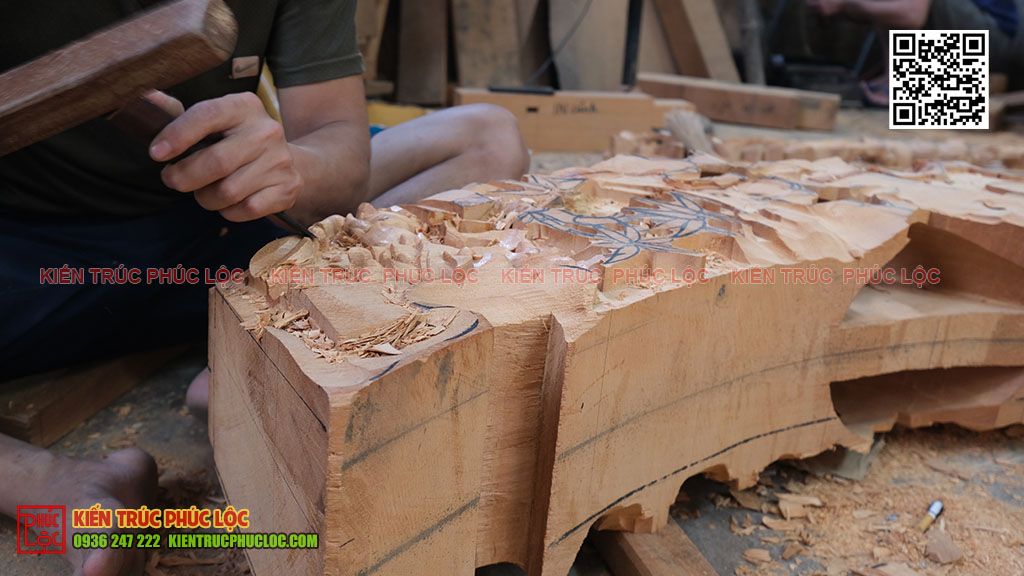 Các nghệ nhân thường chọn loại gỗ lim hoặc gỗ mít để dễ tạo hình, đồng thời giữ được độ bền theo thời gian. Quá trình này đòi hỏi sự kiên nhẫn, tỉ mỉ và kỹ thuật cao, vì chỉ cần một sai lệch nhỏ cũng có thể làm hỏng cả bố cục tổng thể.