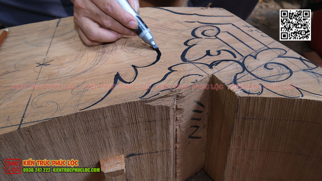 Sau khi thống nhất bản vẽ, nghệ nhân dùng bút mực phác trực tiếp lên bề mặt gỗ. Đây là bước quan trọng để xác định ranh giới và vị trí từng chi tiết.